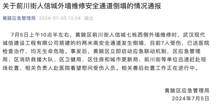 武汉黄陂区应急管理局通报,7月5日上午10点半左右,黄陂区前川街人信城七栋西侧外墙维修时,武汉现代诚信建设工程有限公司搭建的约两米高安全通道发生倒塌,目前7人受伤,正规配资平台网已送医院检查治疗,均无生命危险。事发后,黄陂区立即启动应急联动机制,区应急管理局、区消防救援大队、区卫健局、区住房和城市更新局、前川街等单位迅速赶赴现场处置,相关负责人赴医院看望慰问受伤人员。相关善后处置工作正在进行中。