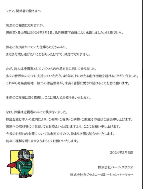 漫画出版社集英社于星期五(3月8日)发布公告称,2024年3月1日,鸟山明因急性硬膜下血肿而去世,享年69岁。
